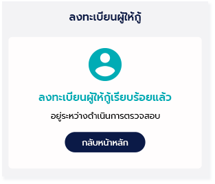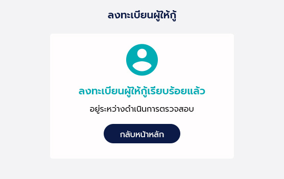 หลังจากที่กดยืนยันเพื่อส่งข้อมูลแล้ว จะมีหน้าต่าง แจ้งเตือนว่า “ท่านลงทะเบียนผู้ให้กู้เรียบร้อยแล้ว อยู่ระหว่างดำเนินการตรวจสอบ”