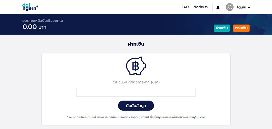 1. เมื่อเข้าระบบได้แล้วผู้ให้กู้ ต้องโอนเงินเข้าบัญชีของได้เงิน สำหรับการทำการให้กู้ โดยกดที่ปุ่มฝากเงิน