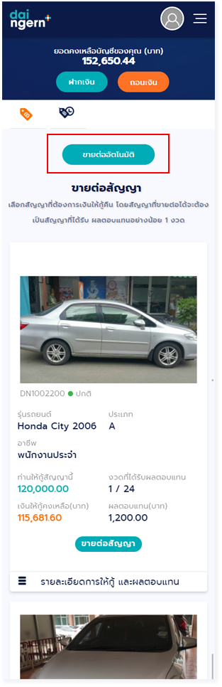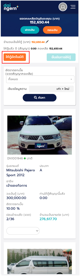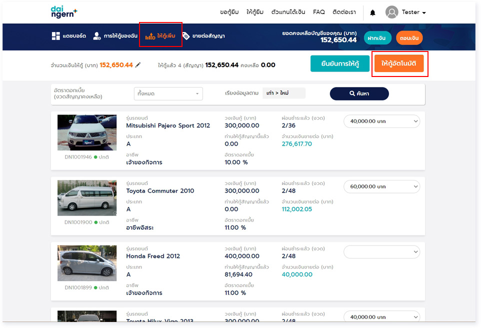 1. ที่เมนูให้กู้เพิ่ม จะมีรายการรถ ให้ผู้ให้กู้เลือกให้กู้ได้ตามจำนวนเงินที่เหมาะสม โดยเลือกให้กู้ที่ละคันหรือเลือกให้กู้อัตโนมัติ เพื่อให้แพลตฟอร์มทำการเลือกรายการที่ดีที่สุดให้