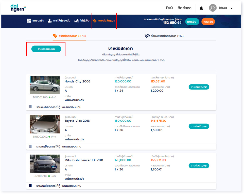 2. เมนูขายต่อสัญญา จะมีรายการสัญญาที่ผู้ให้กู้ถือไว้อยู่ ผู้ให้กู้สามารถเลือกขายต่อได้ทีละคัน หรือเลือกขายต่ออัตโนมัติ เพื่อให้แพลตฟอร์มทำการเลือกรายการที่ดีที่สุดให้ สัญญาที่อยู่ระหว่างรอผู้มาซื้อ จะอยู่ที่แถบกำลังขายต่อสัญญา
