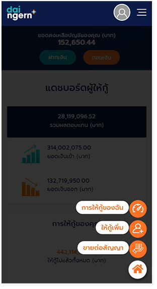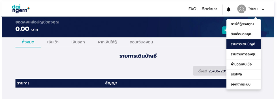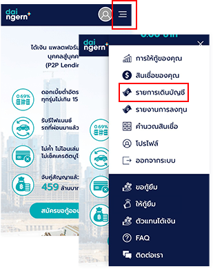 1. เข้าสู่รายการเดินบัญชีได้ โดยไปที่สัญลักษณ์ ที่อยู่ด้านหลังข้อมูลโปรไฟล์ (ชื่อผู้ให้กู้) และเลือกเมนู “รายการเดินบัญชี”