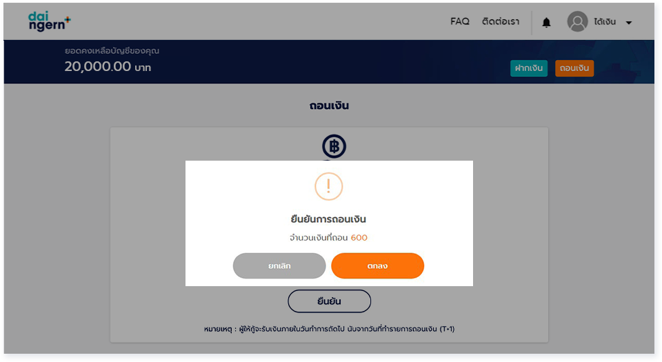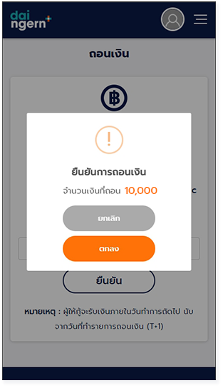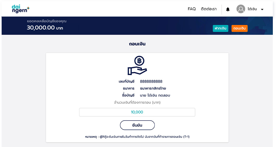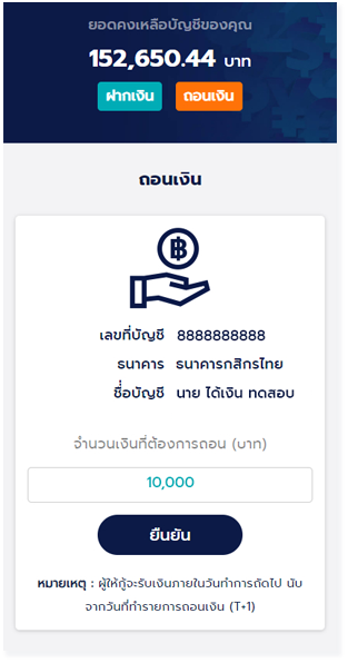 3. ในหน้าถอนเงิน ให้ผู้ให้กู้ใส่จำนวนเงินที่ต้องการถอน จากนั้นกดปุ่ม “ยืนยัน”