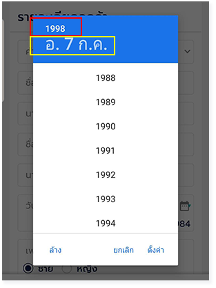 ในส่วนของการเลือกข้อมูลวันที่สำหรับระบบปฎิบัติการ Android กดเลือก ค.ศ. ที่ส่วนกรอบสีแดง และเลือกวันที่ ที่ส่วนกรอบสีเหลือง