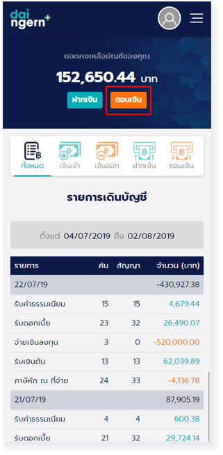 2. หากต้องการถอนเงินสามารถไปที่หน้ารายการเดินบัญชีแล้วเลือกรายการ “ถอนเงิน” เงินที่ทำรายการถอน จะถูกโอนเข้าบัญชีธนาคารของลูกค้าในวันทำการถัดไป